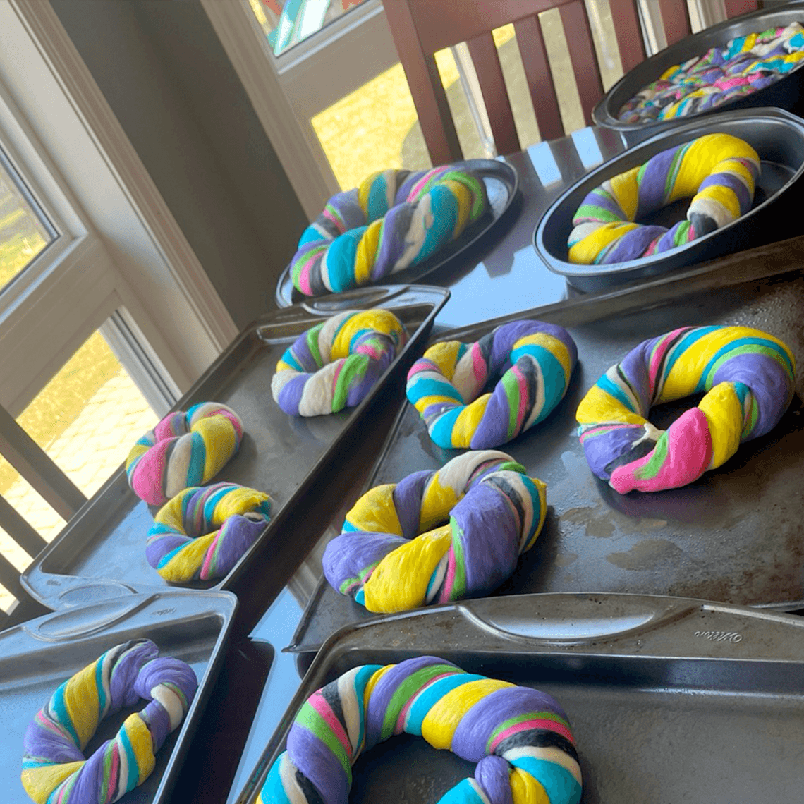 We stepped out on a limb, making 7 batches of dough, and our first draft of a simple one-page story telling the good news, using the seven (“Easter” looking) colors we selected. We prayerfully gave our “loaves and fishes”, so to speak. School teachers and neighbors loved the bread and some even shared that they had read the story with their family. It was so fun and so well received that this has become a yearly tradition, with us making more and more loaves to share (especially with those whom have expectation of receiving “their” yearly loaf of Good News Bread).
