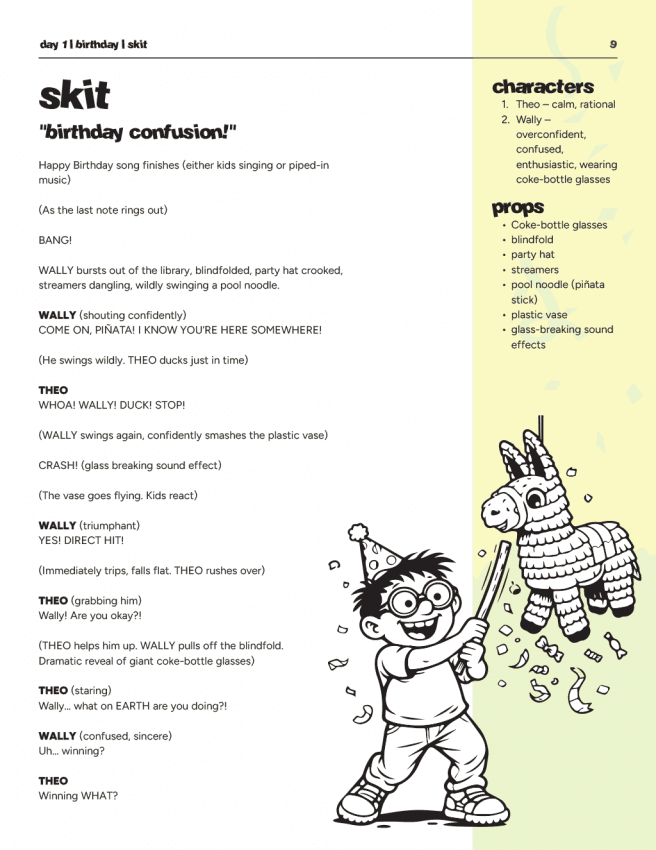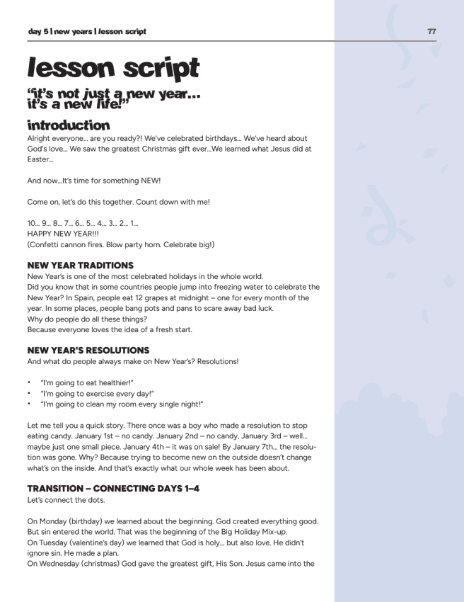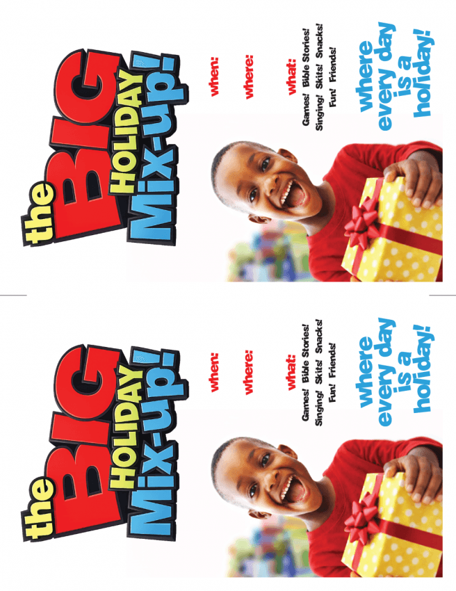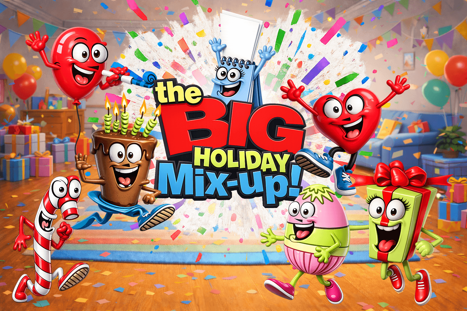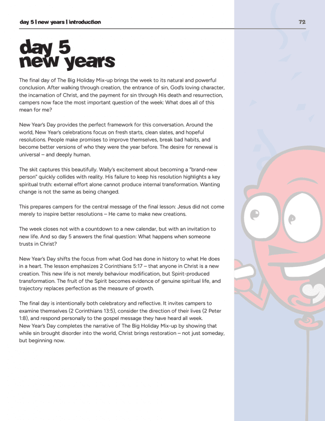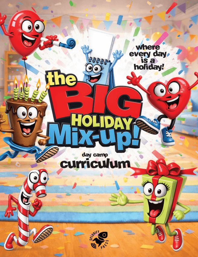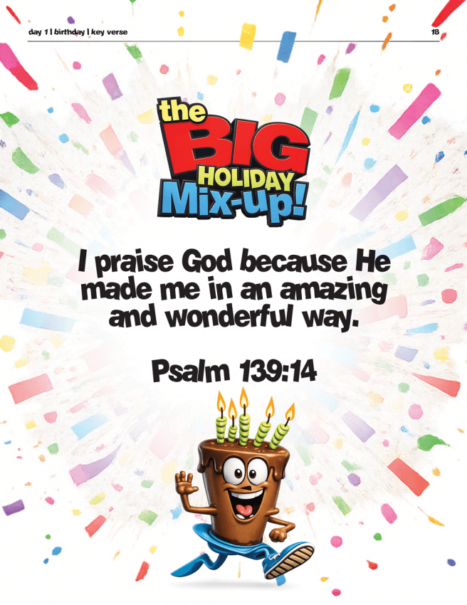 The Big Holiday Mix-up is a day camp curriculum that teaches the gospel story through five familiar celebrations—Birthday, Valentine’s Day, Christmas, Easter, and New Year’s—intentionally celebrated out of season and out of order during a summer camp week, decorated with holiday specific decorations each day.